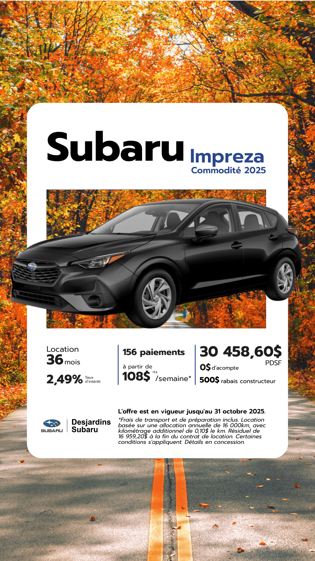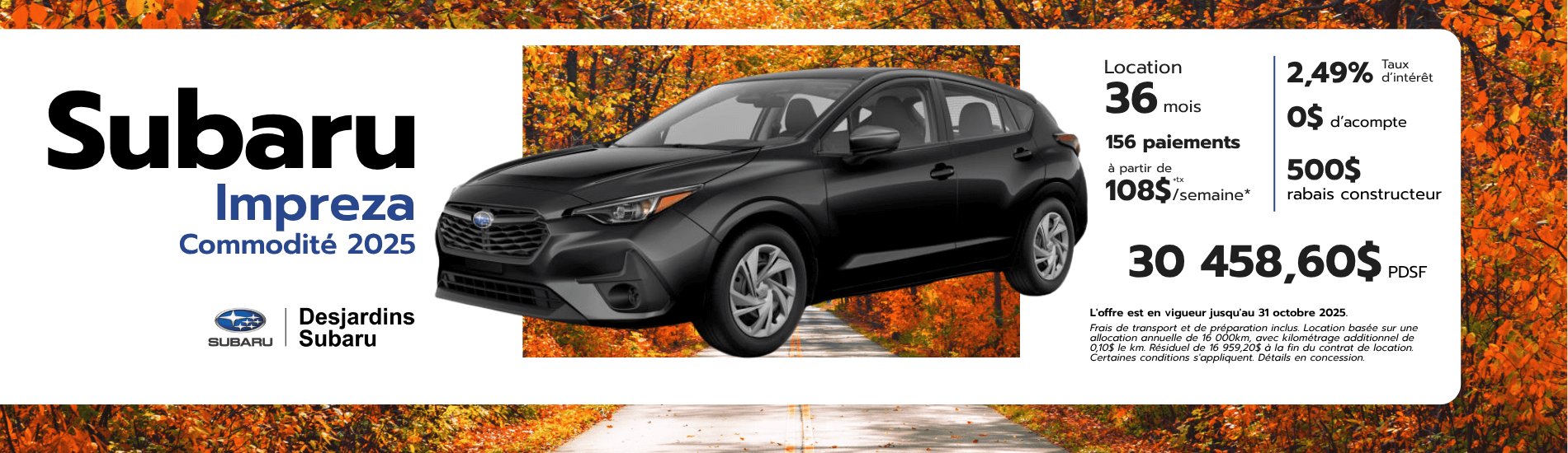 We not only help you find your next vehicle and take care of it, but also offer great deals on [Subaru promotions](https://www.desjardinssubaru.com/en/rebate-program-new-vehicles/).